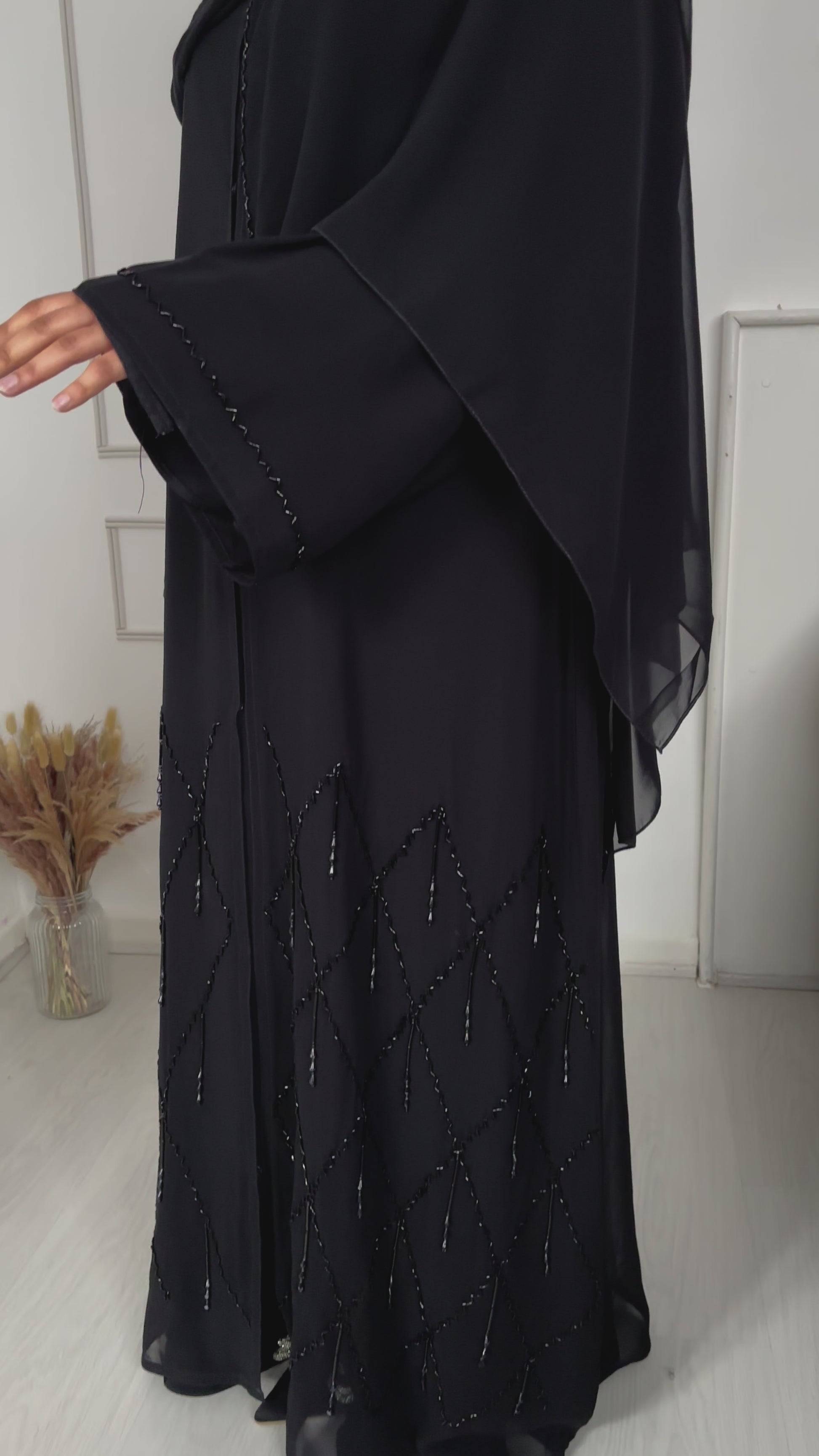 Our Three-Piece Black Chiffon Abaya combines sophistication and grace, featuring beautiful hand-sewn details on the sleeves and bottom front. This set includes an inner slip dress and a matching hijab for a complete, elegant look.