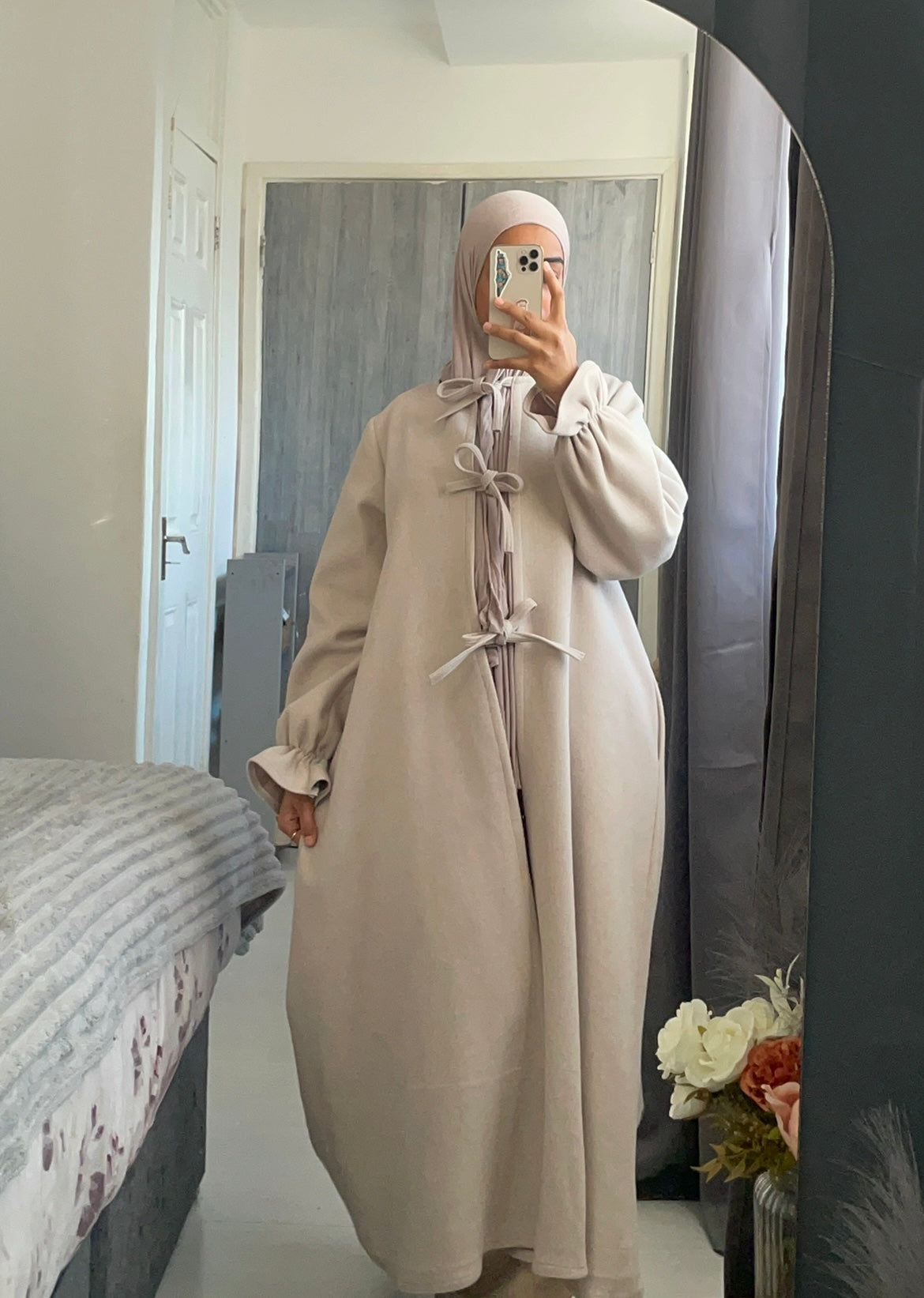 Stay stylish and comfortable in our Beige Modest Coat, a full-length outerwear piece designed for layering with elegance. The soft, neutral beige shade and flowing silhouette create a modest yet sophisticated look, perfect for cooler weather.