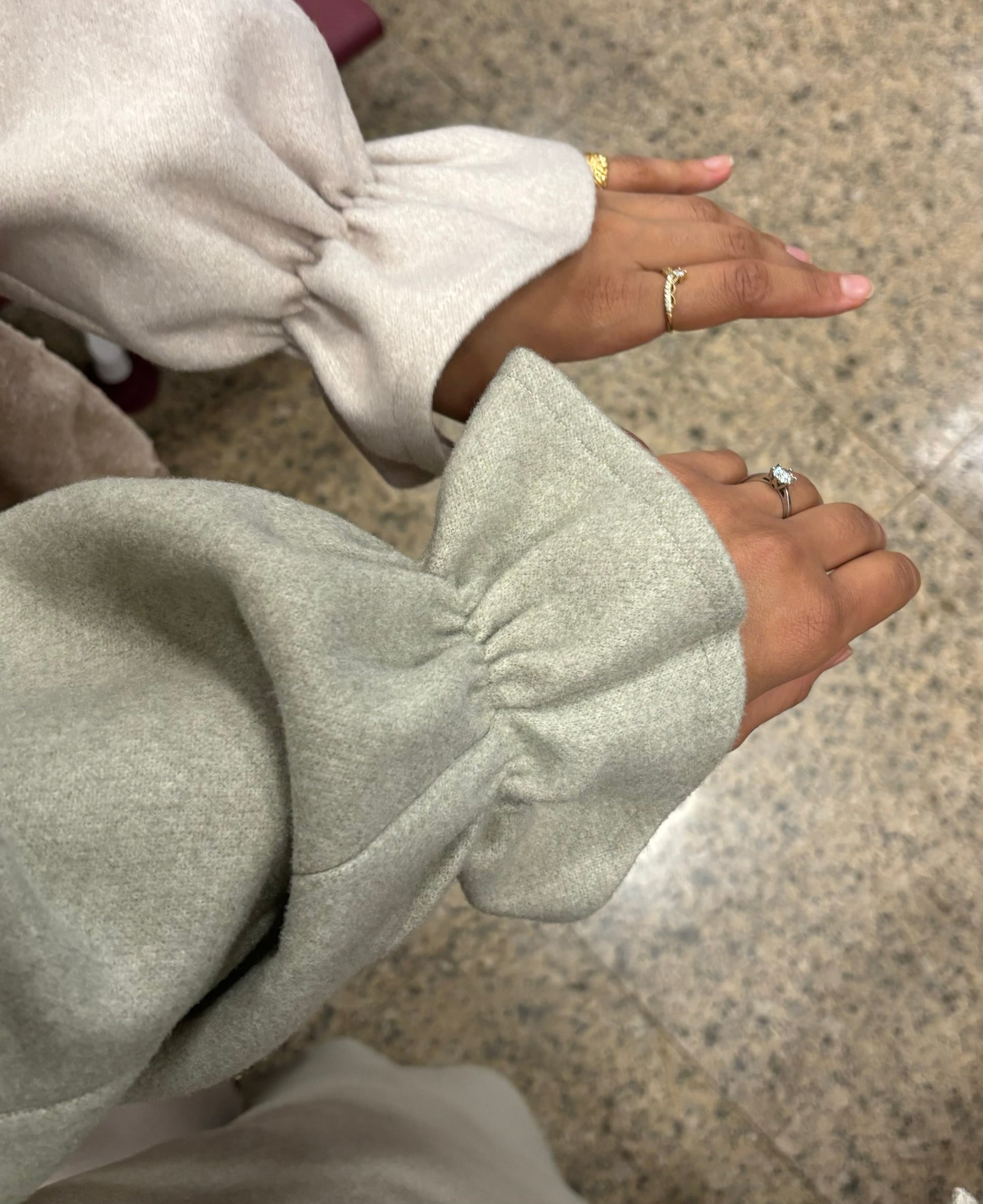 - Voluminous sleeves with gathered cuffs for a comfortable and chic fit